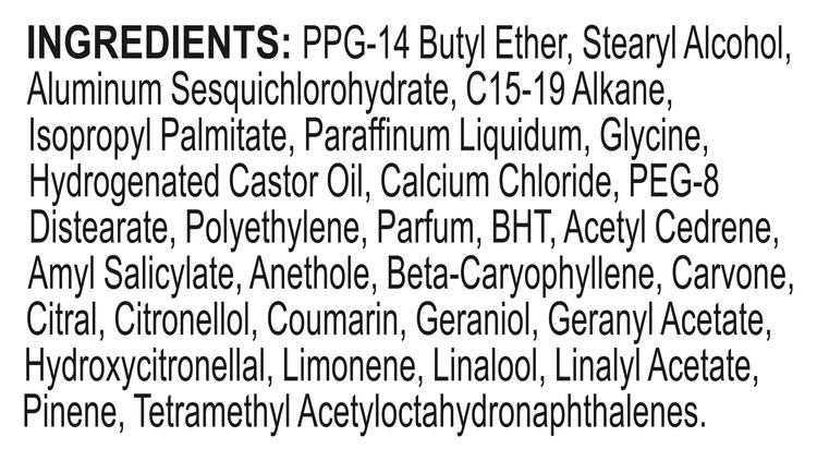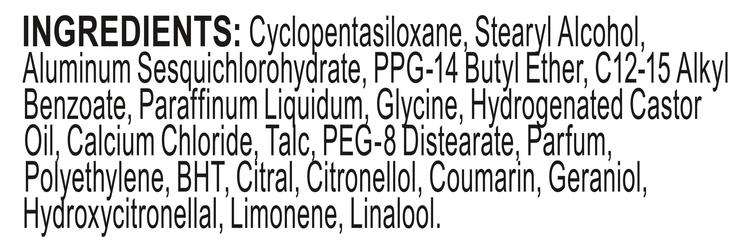 CYCLOPENTASILOXANE, STEARYL ALCOHOL, ALUMINUM SESQUICHLOROHYDRATE, PPG-14 BUTYL ETHER, C12-15 ALKYL BENZOATE, PARAFFINUM LIQUIDUM, GLYCINE, HYDROGENATED CASTOR OIL, CALCIUM CHLORIDE, TALC, PEG-8 DISTEARATE, PARFUM, POLYETHYLENE, BHT, CITRAL, CITRONELLOL, COUMARIN, GERANIOL, HYDROXYCITRONELLAL, LIMONENE, LINALOOL.