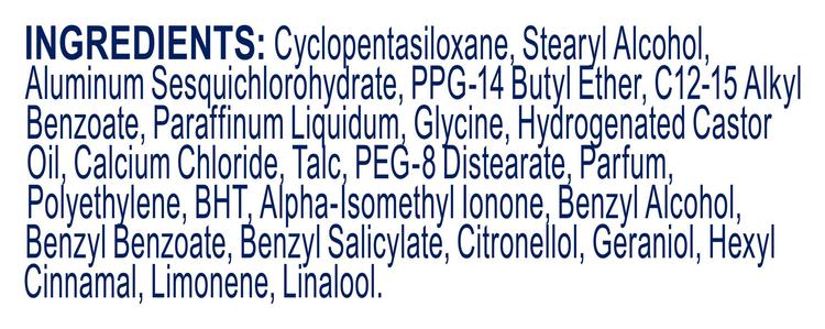 CYCLOPENTASILOXANE, STEARYL ALCOHOL, ALUMINUM SESQUICHLOROHYDRATE, PPG-14 BUTYL ETHER, C12-15 ALKYL BENZOATE, PARAFFINUM LIQUIDUM, GLYCINE, HYDROGENATED CASTOR OIL, CALCIUM CHLORIDE, TALC, PEG-8 DISTEARATE, PARFUM, POLYETHYLENE, BHT, ALPHA-ISOMETHYL IONONE, BENZYL ALCOHOL, BENZYL BENZOATE, BENZYL SALICYLATE, CITRONELLOL, GERANIOL, HEXYL CINNAMAL, LIMONENE, LINALOOL.