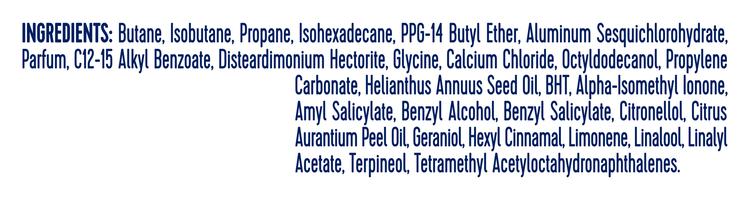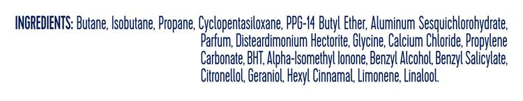 BUTANE, ISOBUTANE, PROPANE, CYCLOPENTASILOXANE, PPG-14 BUTYL ETHER, ALUMINUM SESQUICHLOROHYDRATE, PARFUM, DISTEARDIMONIUM HECTORITE, GLYCINE, CALCIUM CHLORIDE, PROPYLENE CARBONATE, BHT, ALPHA-ISOMETHYL IONONE, BENZYL ALCOHOL, BENZYL SALICYLATE, CITRONELLOL, GERANIOL, HEXYL CINNAMAL, LIMONENE, LINALOOL.