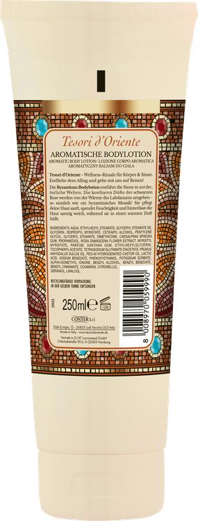 Tesori d'Oriente Byzantium Body Lotion tager dig med på en sensuel rejse til de fascinerende og mystiske verdener i det gamle Østen. Denne rige bodylotion er beriget med den forførende duft af sort rose, som omsluttes af den varme, balsamiske note af labdanum - lige så forførende og tiltrækkende som en byzantinsk mosaik. Lotionen plejer skånsomt din hud, giver intensiv fugt og efterlader den med en luksuriøs og fløjlsblød fornemmelse. Oplev den fortryllende duft og vidunderlige hudpleje, der vil forføre dine sanser og forkæle din hud.