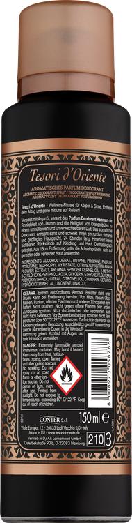 Oplev Tesori d'Oriente Deodorant Spray Hammam, en luksuriøs parfumedeodorant, der kombinerer sensualiteten fra jasmin med friskheden fra appelsinblomst. Beriget med dyrebar arganolie får denne deodorant din hud til at føle sig helt sikker og velplejet i op til 24 timer. Den aromatiske spray opfrisker blidt og efterlader ingen synlige rester på huden eller tøjet. Den kombinerer en deodorants egenskaber med en parfumes og skaber afslappende øjeblikke med stilfulde, sensuelle nuancer.