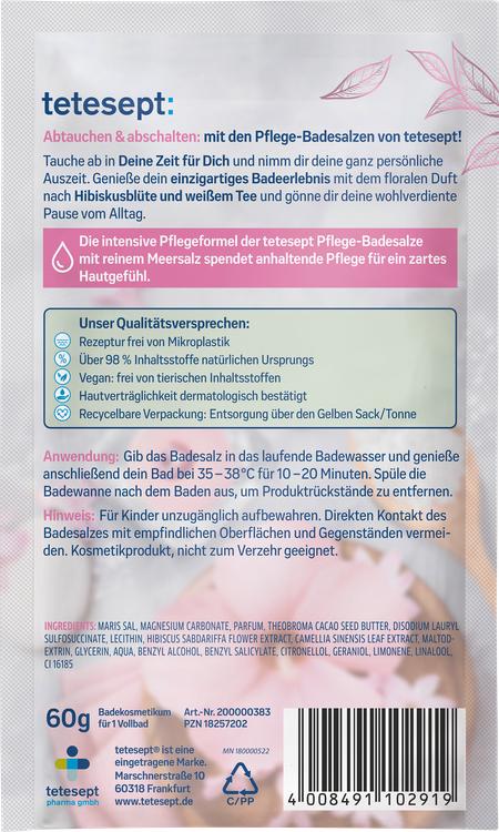 Forkæl dig selv med en velfortjent pause med Tetesept badesalt 'Your time for yourself'. Dette nærende badesalt fører dig ind i en afslappende verden, hvor du kan fordybe dig og lægge hverdagen bag dig. Den blomsteragtige duft af hibiscusblomst og hvid te sikrer en unik badeoplevelse, der forkæler krop og sjæl. Formlen består af over 98% naturlige ingredienser, er vegansk og fri for animalske ingredienser. Badesaltene er også dermatologisk testet og leveres i genanvendelig emballage. Nyd den beroligende effekt, og lad dig omslutte af den beroligende atmosfære.