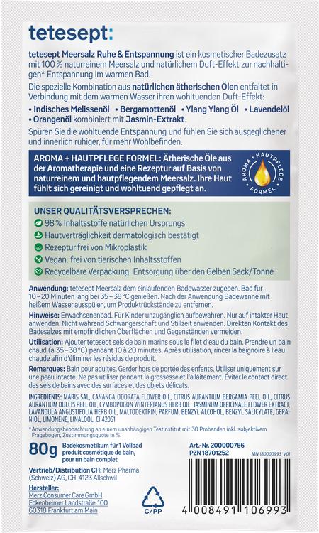 Slap af i krop og sind med Tetesept Health Bath Calm & Relaxation Bath Salts. Dette særlige badetilskud er baseret på 100 % rent naturligt havsalt og kombinerer de gavnlige egenskaber af æteriske olier, som er specielt skræddersyet til behovene ved fysisk og mental anspændthed. Den harmoniske duftsammensætning med indisk citronmelisseolie, bergamotolie, ylang ylang, lavendel og appelsinolie, suppleret med jasminekstrakt, udfolder sin fulde effekt i varmt vand. Mærk, hvordan hverdagens hektiske tempo forvandles til velvære og indre ro for hvert bad. Forkæl dig selv med dette særlige øjeblik af afslapning, og lad de naturlige dufte omslutte dig.